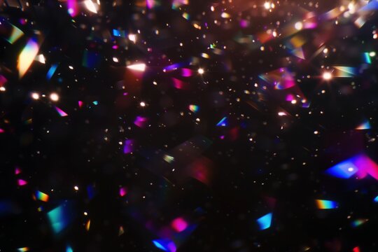 Vibrant abstract rainbow light reflections on dark background. Ideal for creative design, futuristic theme, colorful effects. Blurry sparkling particles in the air, festive light effect