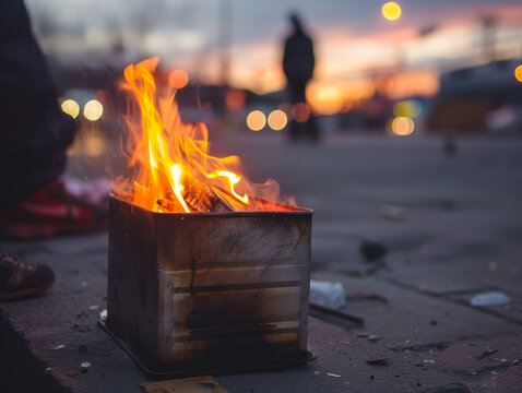 A fire blazes in a bin on a city street, providing warmth on a cold evening. ​