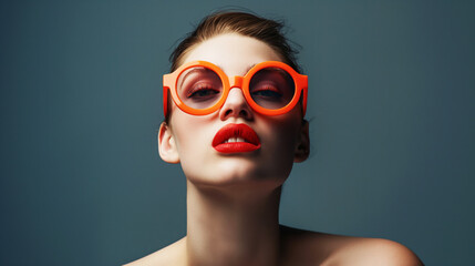 Close-up portrait of a person with bright orange round sunglasses and bold red lipstick on a dark gray background.