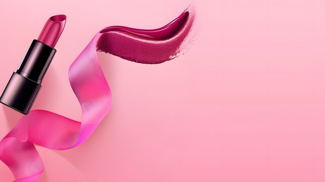Pink lipstick with a bold smear and ribbon detail on a soft pink background for cosmetic and beauty product advertisements