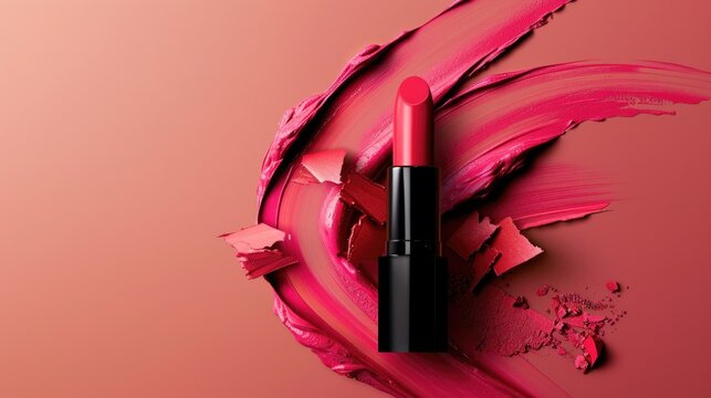 An open lipstick with smudged lipstick strokes forming abstract patterns around it, creating a bold artistic beauty concept