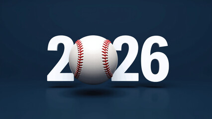 Baseball replaces zero in bold 2026 on blue backdrop.