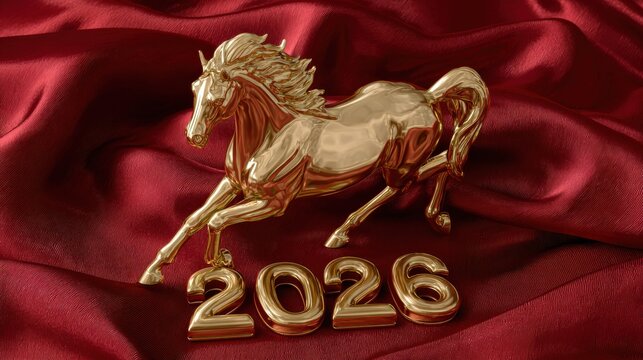 Golden Horse of 2026: A radiant golden horse sculpture, symbolizing power and elegance, stands majestically upon a rich, red silk, with the bold numbers '2026' representing future.