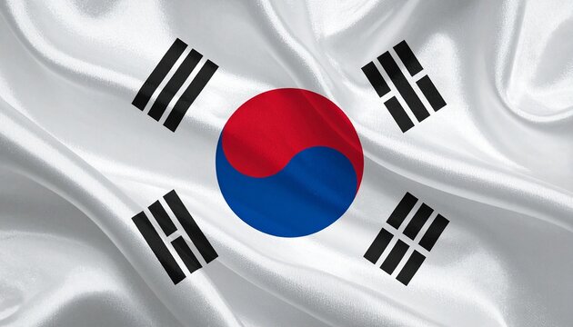 Oil-paint textured illustration of the South Korea flag, white field with Taegeuk symbol and black trigrams, flowing fabric motion, soft folds, bold contrast, expressive brush strokes, high detail.