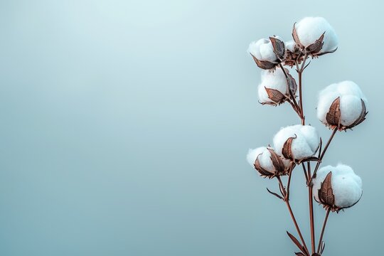 Beautiful cotton branch on blue background top view copy space. Flat lay.  Delicate white cotton flowers. Cotton production