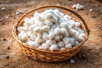 raw white cotton boll harvested in basket on farm field