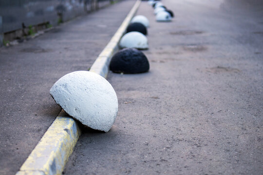 Dome shaped bollards installed along the sidewalk as an anti-parking measure, providing pedestrian safety and preventing unauthorized vehicle access in urban areas. Bollards in row closeup
