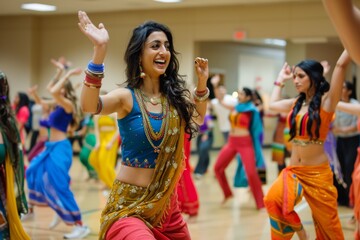 Colorful Bollywood Dance Fitness Class: Lively Music, Joyful Participants in Vibrant Outfits