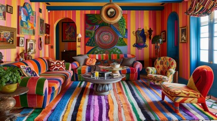 This vibrant living room exudes maximalist charm featuring an abundance of colorful stripes and statementmaking decor.