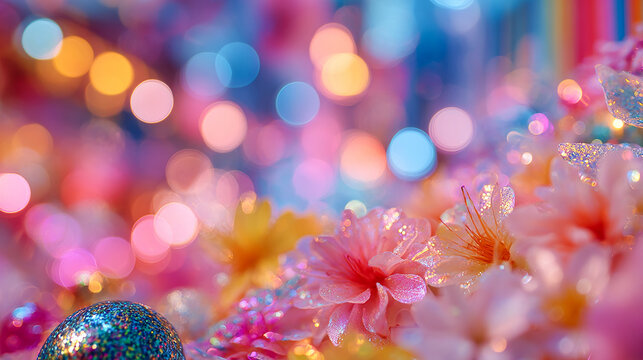 Empty background for text input, bright dopamine Christmas decor, neon colors, decorations and large candies, festive maximalist atmosphere, soft bokeh and glowing garlands