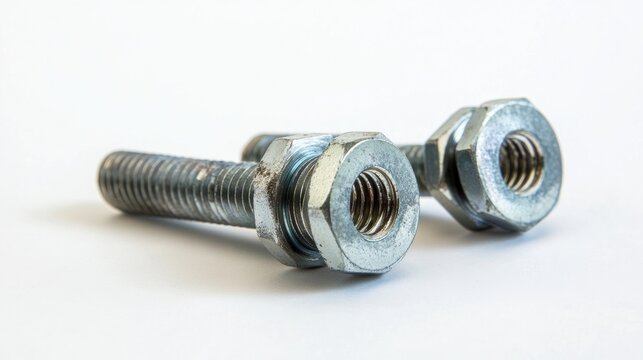 Steel metal bolts and nuts close up on a white background showcasing industrial hardware for construction and mechanical applications