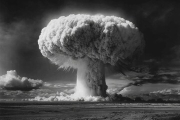 The explosion of an atomic bomb captured in black and white, with a dramatic mushroom cloud rising into the sky, symbolizing Hiroshima Day��s devastating power.