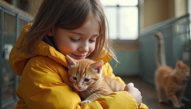 Young girl holds small orange kitten in yellow coat. Another cat walks nearby in animal shelter. Girl shows tenderness, affection towards her new pet. Joyful child bonds with kitty.