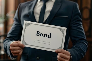 businessman behind hold bond certificate with word Bond on center. minimal background. generative AI