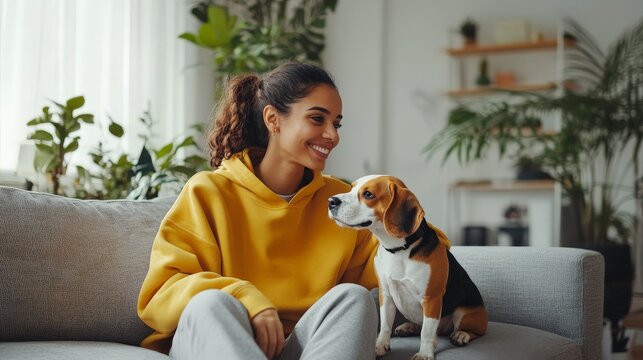 Woman in yellow hoodie relaxing with her dog on a cozy sofa in a bright living room