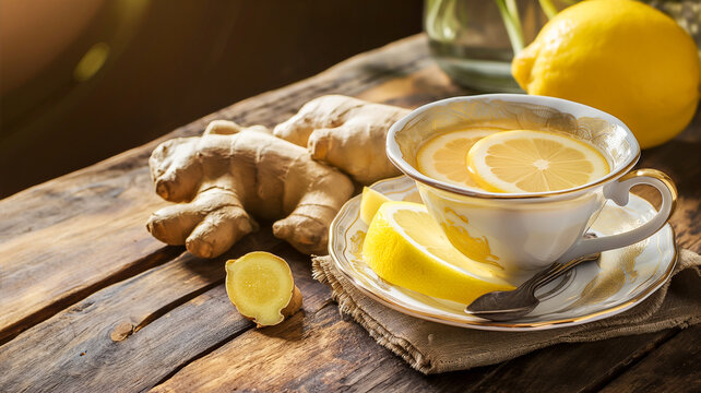 Ginger and lemon tea. Served in an antique bone china porcelain cup. Surrounded by slices of raw ginger and fresh lemon. Warm soft light accentuates the feeling of comfort.