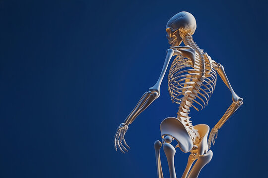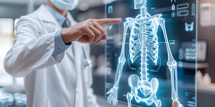 Doctor man pointing on arm of human skeleton anatomical model. Physiotherapist explaining joints model. Chiropractor or osteopath points to the skeleton of human body. Bones anatomy close up.