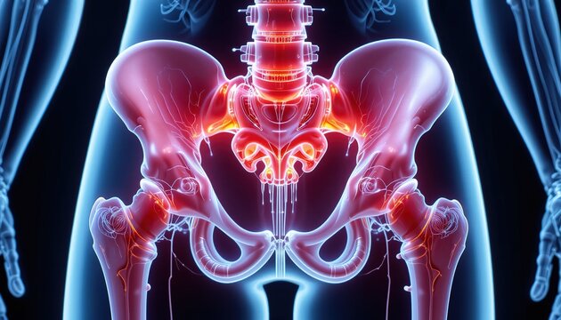3D rendering of human knee joint X-ray, showcasing bones and a highlighted area, symbolizing medical imaging, orthopedic health, or pain.