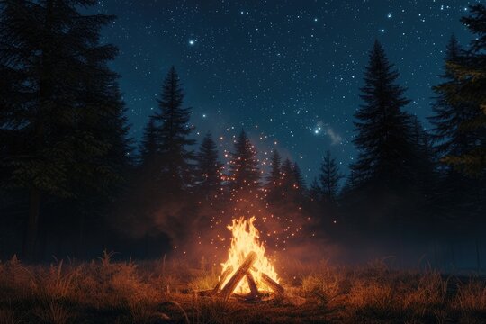 A cozy bonfire crackling under the starry night sky in a dense forest, casting a warm glow on the surrounding trees. 8k
