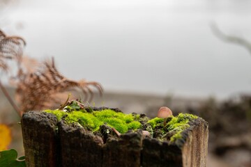 Burgundydrop bonnet mushroom fungus growing in moss on a wooden post