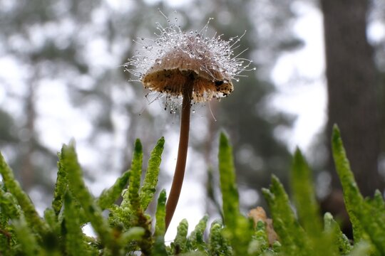Bonnet mold growing on a mushroom as a parasitic mold. Shot in a boreal forest in Estonia, Northern Europe.