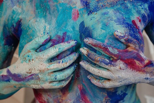 Colorful anonymous model covering boobs