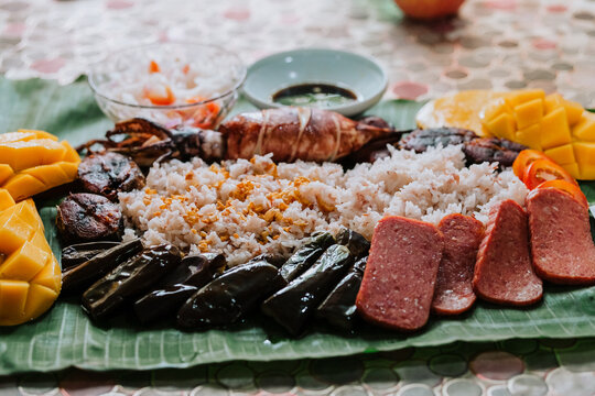 Boodle fight style of eating. A traditional filipino way of eating together with family and friends