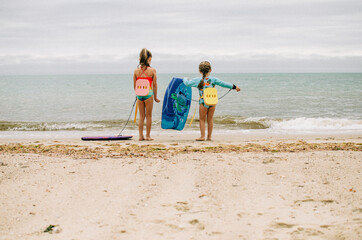 Twins brother and sister to have fun with surfing in the ocean