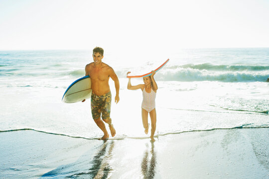 Father and daughter carrying surfboard and bodyboard on beach