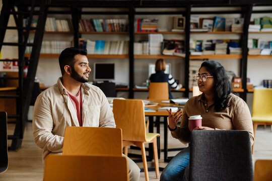 Indian man and woman students talking and drinking coffee while sitting in library