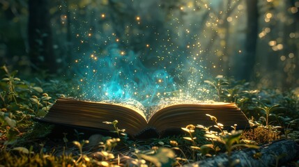 Hovering ancient book above illuminated pedestal with mystical sparks