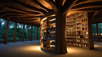 A unique library design featuring a sculptural tree structure in a serene outdoor setting at dusk with illuminated bookshelves