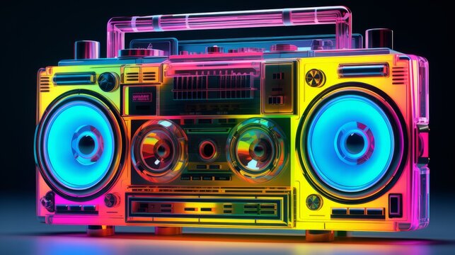 Floating retro boombox on dark background featuring dual speakers and cassette deck