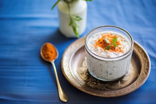 boondi raita topped with cumin and chili powder