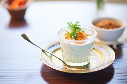 Closeup of boondi raita served with indian food