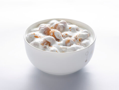 A picture of boondi raita isolated on white background