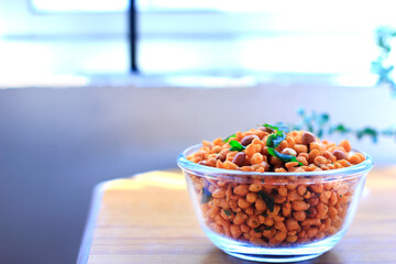 Kara Boondi or Bundi - A traditional Indian namkeen / snack and important Chat item, Served in a bowl. selective focus