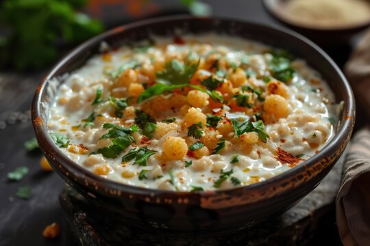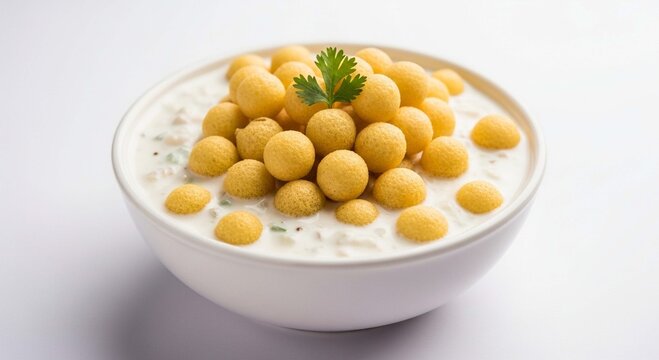Traditional Indian Boondi Raita, a creamy yogurt dish with crispy fried chickpea flour pearls, served in a white bowl.