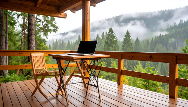 Laptop on deck overlooking forest and mountains ideal for remote work