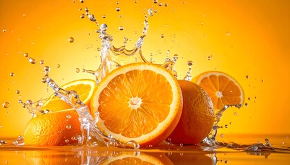 Fresh Oranges Splashing in Water Against a Vibrant Orange Background