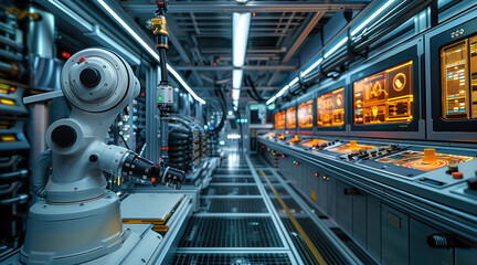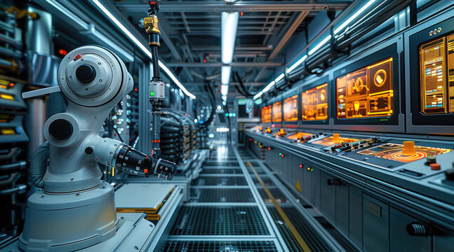 The engineer workspace is filled with advanced machinery and control panels, demonstrating the meticulous process of interface design and the importance. Generative AI.