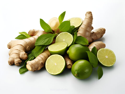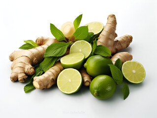Immunity background with lime, ginger and mint, close up. Healthy products for Immunity boosting and cold remedies, top view. Immunity protection ingredients. AI generated