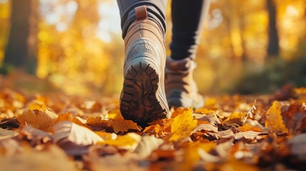 Tying hiking boots on woodland trail closeup, lacing tan leather boots for autumn adventure