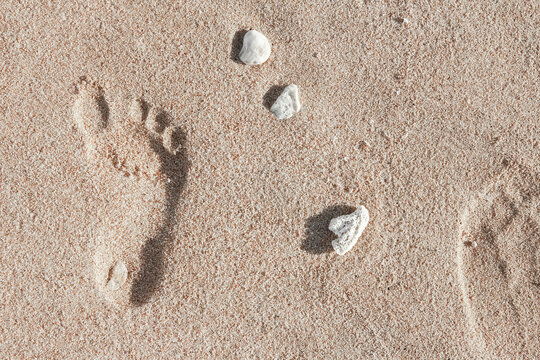 Boot footprint on the dried clay surface. Cracked dry soil with shoeprint. Shoe marks on clay soil. An imprint of the foot of man in shoe. Top view. Close-up. Selective focus.