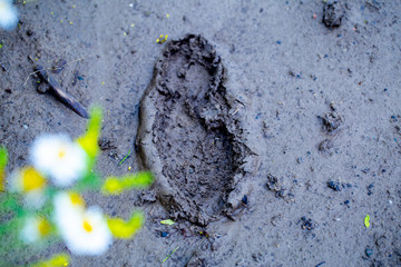 the imprint of dirty shoes in the mud on the country road after rain