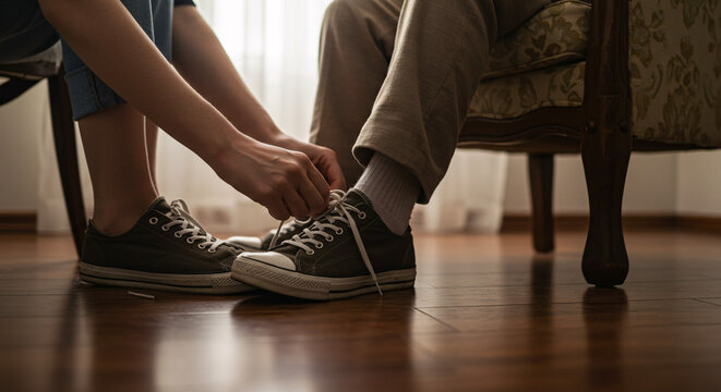 Person helping elderly man tie shoelaces indoors for National Family Caregivers Month