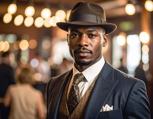 From the Roaring Twenties, a dapper man in a pinstripe suit and fedora, smoking a cigarette in a jazz-filled speakeasy, surrounded by flappers and gangsters