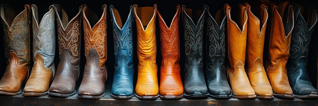 Colorful blue and red cowboy boots and hat on natural wood with blue wooden background