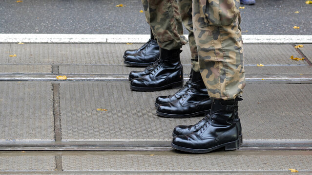 Anonymous unrecognizable generic infantry army soldiers standing at attention in a row on the street, legs boots closeup detail shot, copy space, green camo uniforms. Military operations border patrol