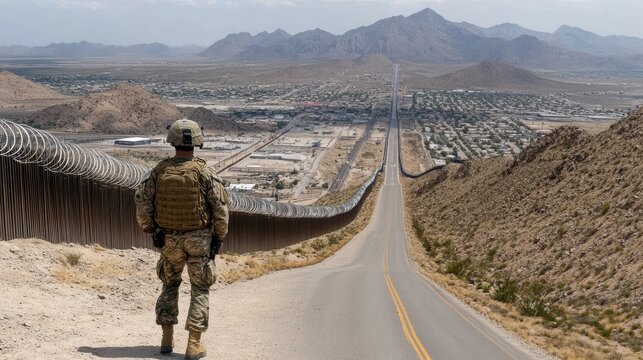 A U.S. Marine stands watch at the border fence in the southern desert, with barbed wire atop concrete walls and mountains in the backdrop, ensuring security in a remote area